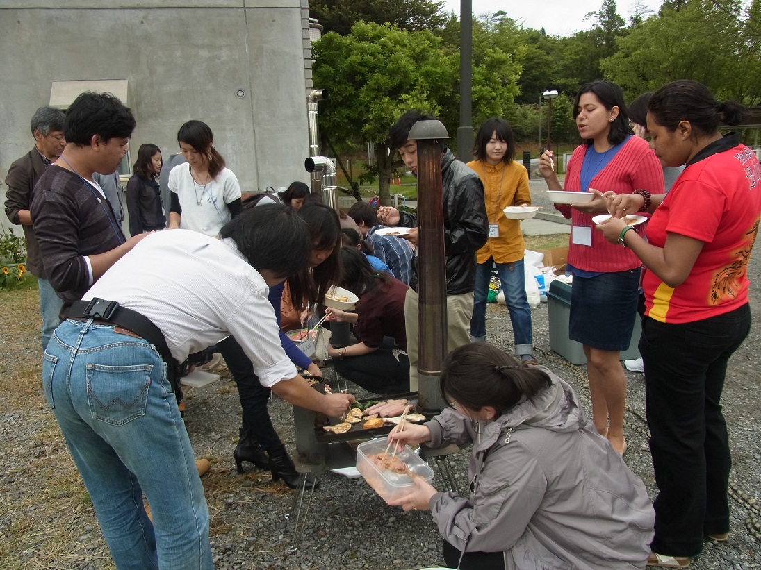その後,屋外に移動しBBQをしながら,留学生と日本人学生,そしてエコネットひがしひろしまのメンバーが交流を深めました。